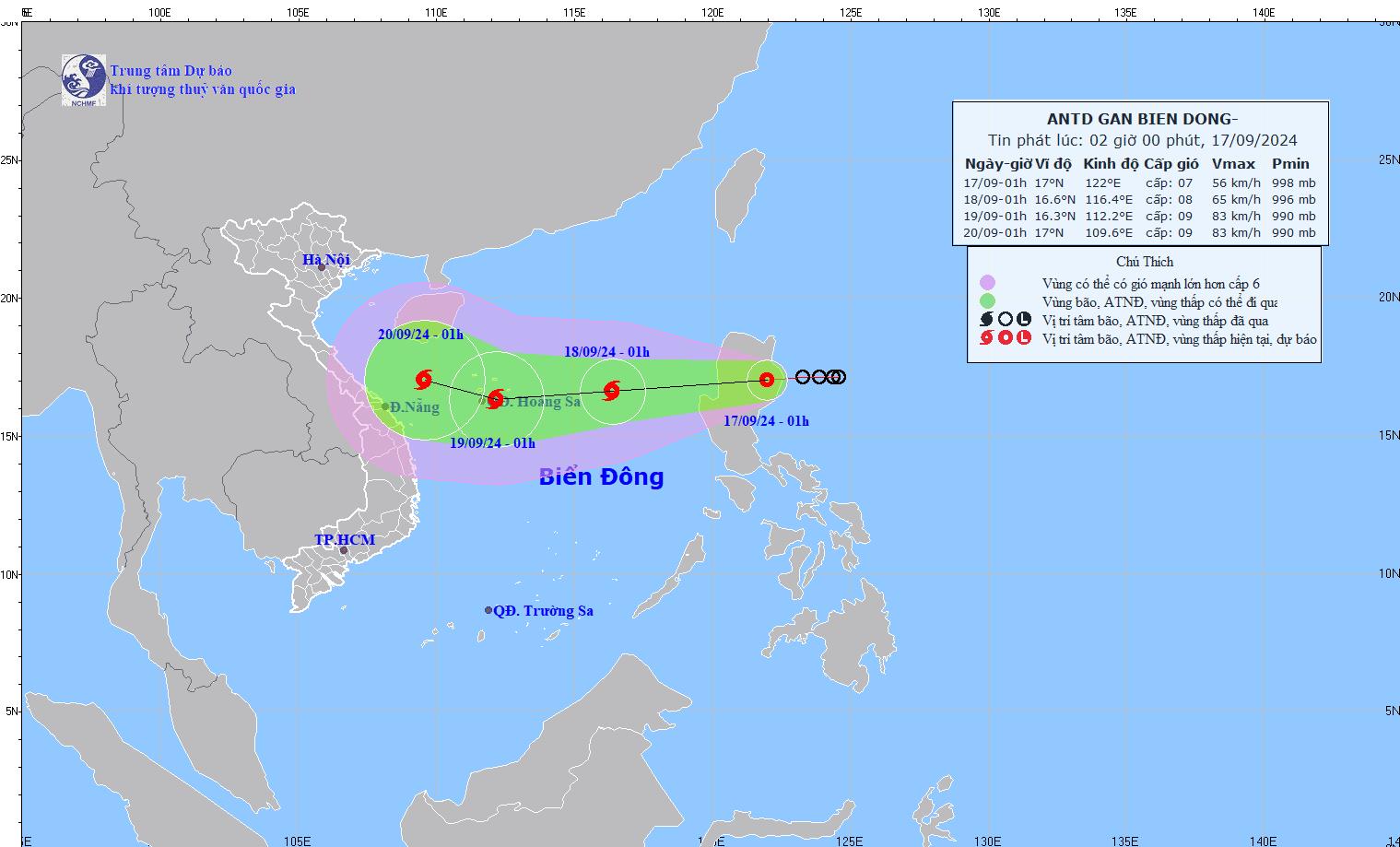 Trong 48 đến 72 giờ tiếp theo, bão có khả năng đổi hướng, di chuyển theo hướng Tây Tây Bắc, mỗi giờ đi được khoảng 10km. Do ảnh hưởng của áp thấp nhiệt đới sau mạnh lên thành bão số 4, vùng biển phía đông của khu vực bắc Biển Đông có gió mạnh cấp 6 - cấp 7, vùng gần tâm bão đi qua cấp 8 (62 - 74 km/giờ), giật cấp 10 (89 - 102 km/giờ), biển động mạnh. Vùng biển phía đông của khu vực bắc Biển Đông sóng biển cao 2 - 4 m, từ chiều và đêm 17.9 tăng lên 3 - 5 m. Tàu thuyền hoạt động trong các vùng nguy hiểm nói trên đều có khả năng chịu tác động của gió mạnh, sóng lớn. Áp thấp nhiệt đới đang tiến vào Biển Đông và có khả năng biến thành bão số 4 với hai kịch bản đổ bộ đáng lo ngại. Vào sáng ngày 17-9, áp thấp nhiệt đới sẽ chính thức bước vào Biển Đông và đến ngày 18-9, hiện tượng này có khả năng phát triển thành bão, với sức gió mạnh lên đến cấp 8 khi đạt đến vùng biển giữa Biển Đông. Chiều ngày 16-9, ông Nguyễn Văn Hưởng, Trưởng phòng Dự báo thời tiết của Trung tâm Dự báo Khí tượng Thủy văn Quốc gia, đã thông báo với báo chí rằng áp thấp nhiệt đới hiện đang hoạt động ở phía Đông đảo Luzon (Philippines) và di chuyển theo hướng Tây với tốc độ khoảng 15 km/giờ. Trong vòng 24 giờ tới, áp thấp nhiệt đới sẽ tiếp tục di chuyển chủ yếu theo hướng Tây, với tốc độ gia tăng lên 15-20 km/giờ. Ông Hưởng nhấn mạnh rằng điểm hình thành của áp thấp nhiệt đới hiện tại tương tự như vị trí hình thành của cơn bão số 3 (Yagi), tức là ở phía Đông đảo Luzon. Tuy nhiên, điều kiện môi trường lúc này không thuận lợi như lần trước, vì hiện tại áp thấp nhiệt đới phải chia sẻ năng lượng và độ ẩm với một cơn bão khác ở Tây Bắc Thái Bình Dương.