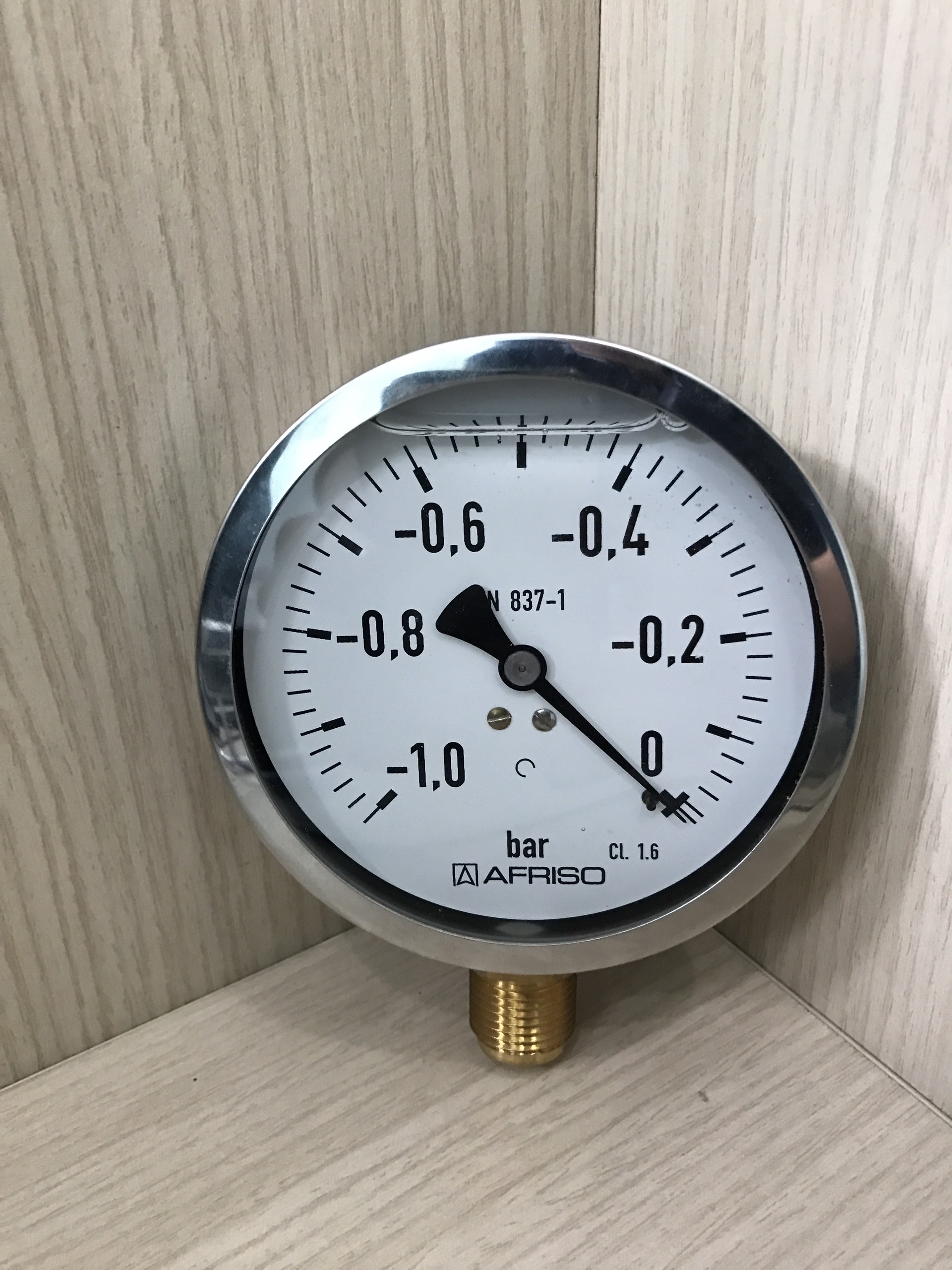 Mặt đồng hồ hiển thị thang đo áp suất âm từ 0 đến -1 bar giúp kỹ sư theo dõi mức chân không trong hệ thống.